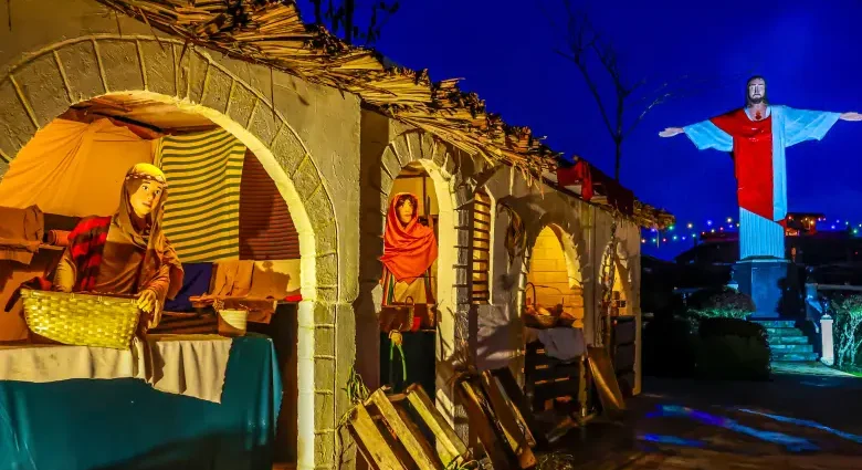 Desde el ingreso, el trayecto marca su intención narrativa. Los visitantes entran a un ambiente románico que introduce el tono del recorrido y, desde allí, avanzan por plantaciones iluminadas, estaciones bíblicas, un molino, casas y un Cristo redentor en la cima de una colina que invita a detenerse, observar y fotografiar. El paseo completo toma un poco más de 40 minutos y se organiza como una secuencia continua, sin atajos, que conduce por distintos momentos del relato cristiano del nacimiento de Jesús.
